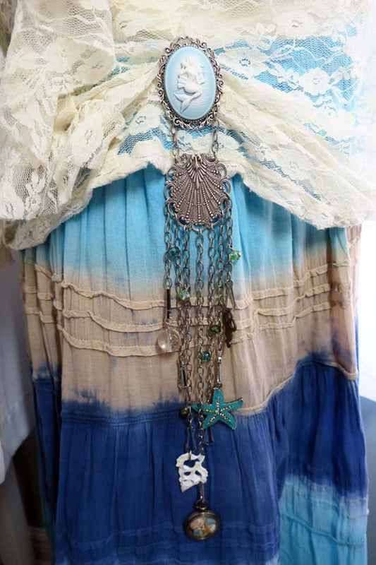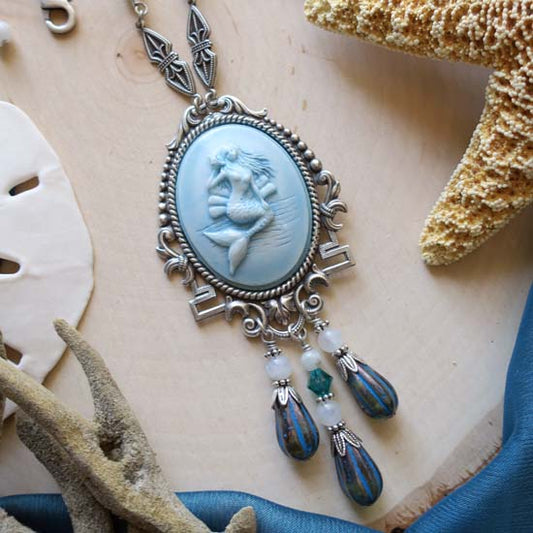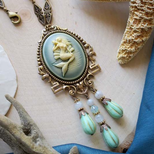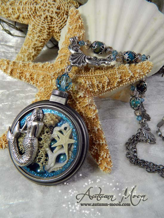 A collection of mermaids, sea creatures and things from the darkest depths of the ocean. Christina has created these ocean inspired pieces using vintage style watch cases, vintage stampings, gemstones, crystals, shells, pearls and Czech glass. Items in this gallery are ready to ship.