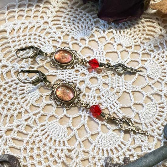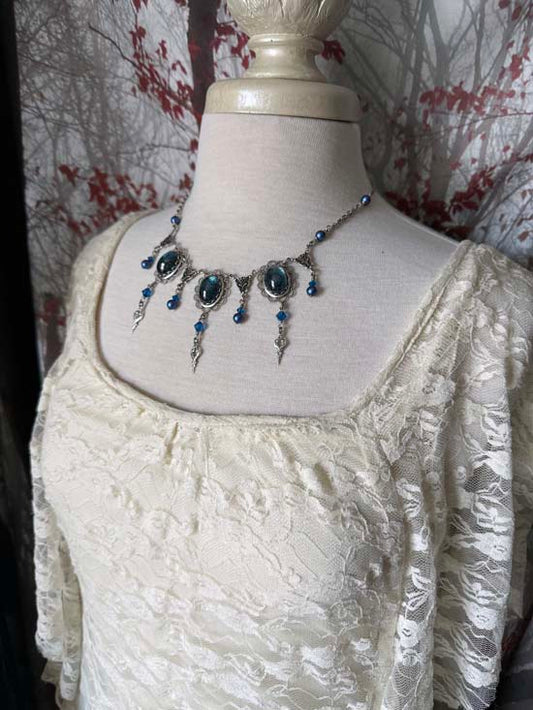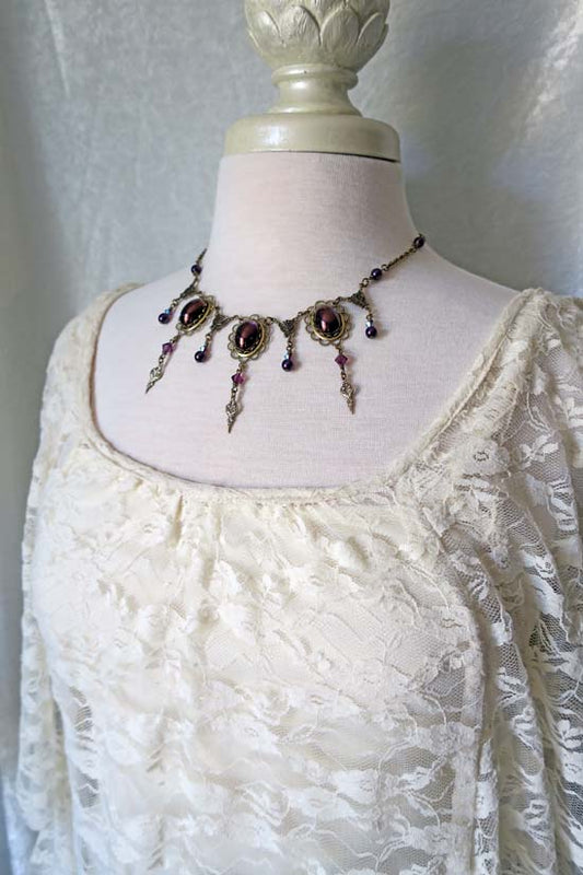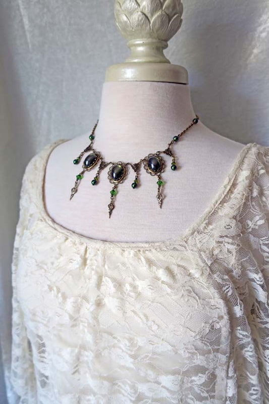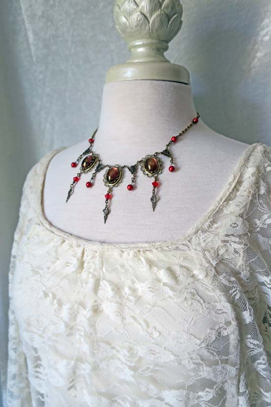 Feel like royalty with jewelry and adornments inspired by the Renaissance Era. These statement pieces are handmade with antique brass and antique silver metal stampings, sparkling crystals and genuine gemstones. Items in this gallery are ready to ship.