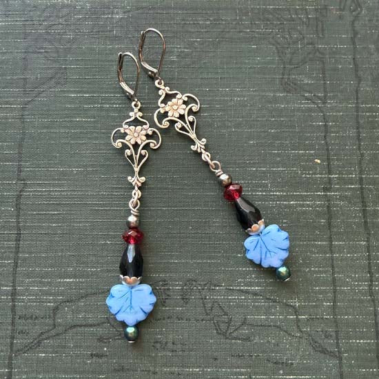 These earrings were created with antique silver plated brass filigree drop, lever back ear hooks, and a mix of Swarovski Crystals and Pearls, blue Czech glass leaves.