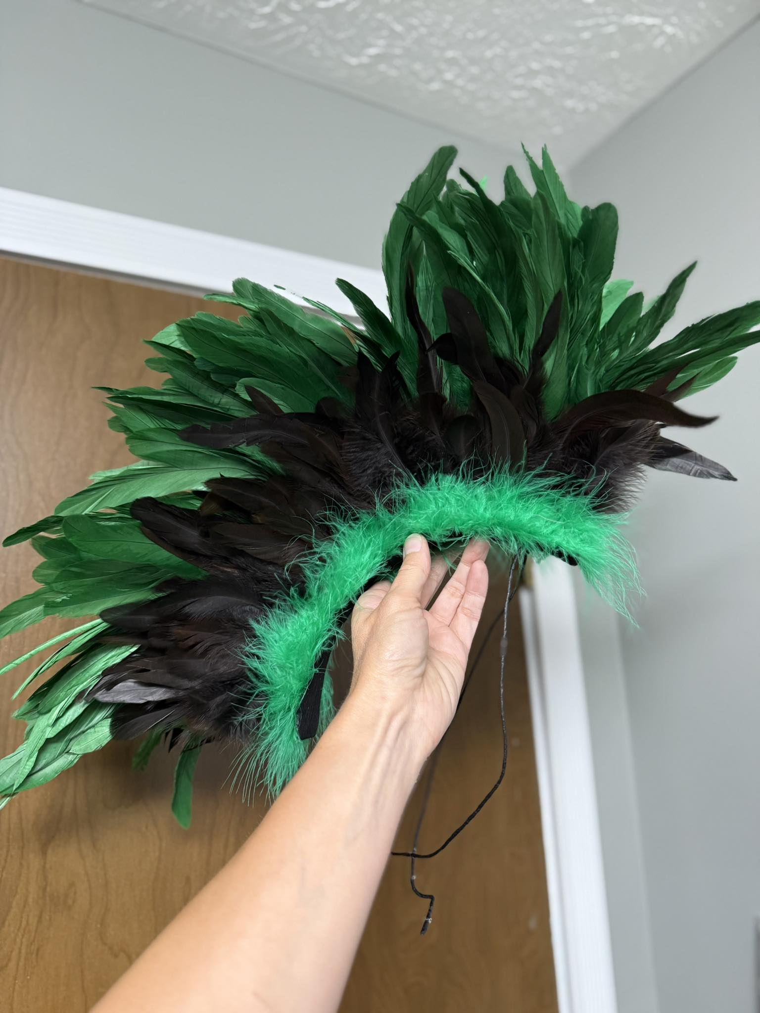 This feather mohawk was created with Kelly green rooster feathers accented with smaller feathers in dark brown, and finished with green feathers at the bottom. Wire holds the piece on your head. Tighten by pulling the wires and twist.
