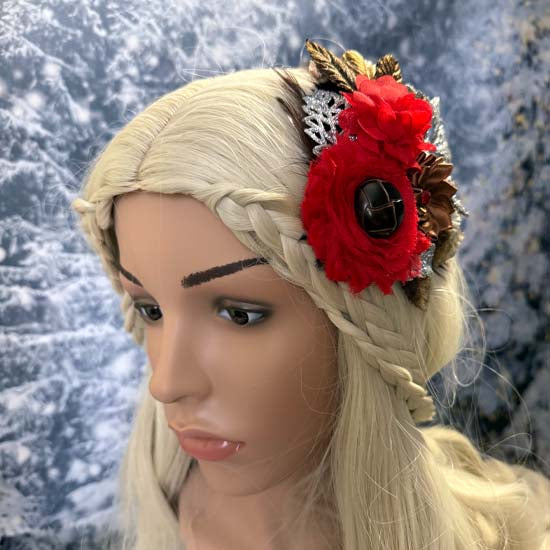 This fascinator was created with a base of dark brown feathers, accented with red fabric flowers, brown ribbon flower with red Swarovski Crystal, variegated brown velvet leaves, silver glitter leaves, and brown vintage button. Alligator clip on the back will clip this piece in your hair, on a jacket, sweater, bag, etc.