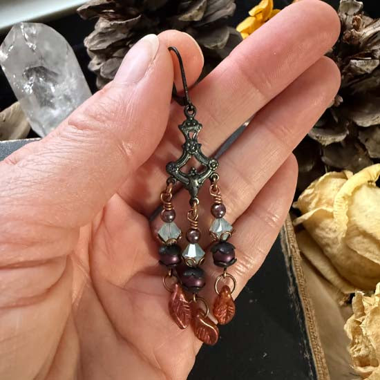 These earrings were created with black plated brass lever back ear hooks, focal drops and accents, antique copper accents, chrysolite opal Swarovski Crystals, mauve and elderberry Swarovski Pearls, and rust colored Czech glass leaves. Lead and nickel free.