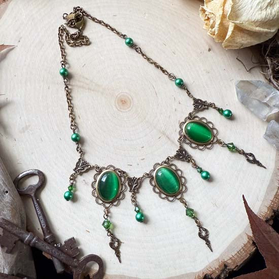 This statement necklace was created with antique brass chain, green Cat's Eye glass cabochons, and matching Swarovski Crystals and Pearls. Lead and nickel free.