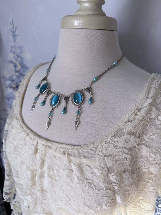 This statement necklace was created with antique sterling silver plated brass chain, aqua blue cat's eye glass cabochons, and matching Swarovski Crystals and Pearls. Lead and nickel free.