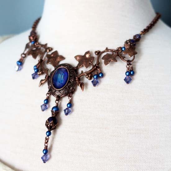This ethereal statement necklace was created with aged copper, Purple Swarovski Crystal focal stone, with River Stone, Swarovski Crystal and Pearl accents in purples and iridescent blue. Lead and nickel free.